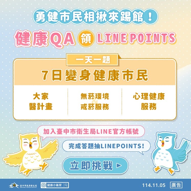 加入臺中市政府衛生局官方LINE帳號,完成答題抽LINE POINTS 5點