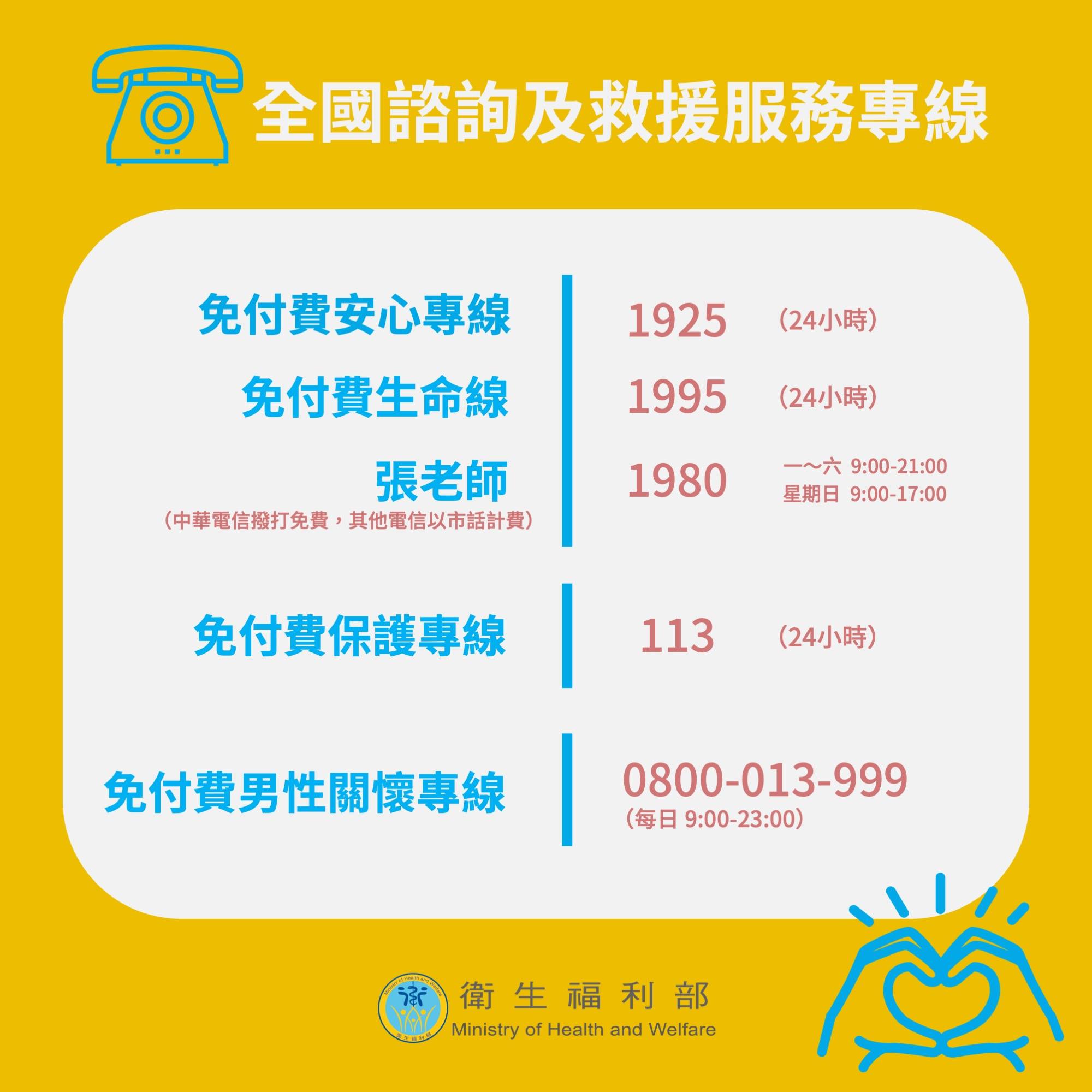 1. 免付費安心專線 1925:政府專線,24 小時,主要提供心理諮詢及自殺危機即時介入、評估、轉介及第三者通報等自殺防治相關服務。